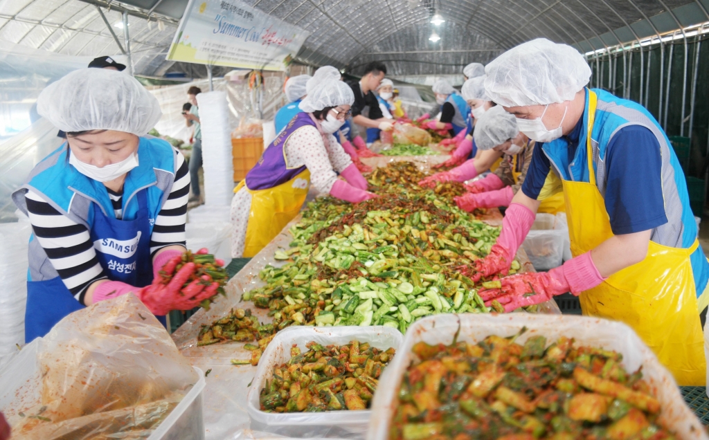 삼성전자 온양캠퍼스는 6월 8일 ‘제8회 Summer Cool 행복나누기’ 행사를 열고 임직원, 지역주민 등 4백여 명이 오이소박이를 함께 만들어 아산지역 저소득가정 1,004가구에 전달했다.