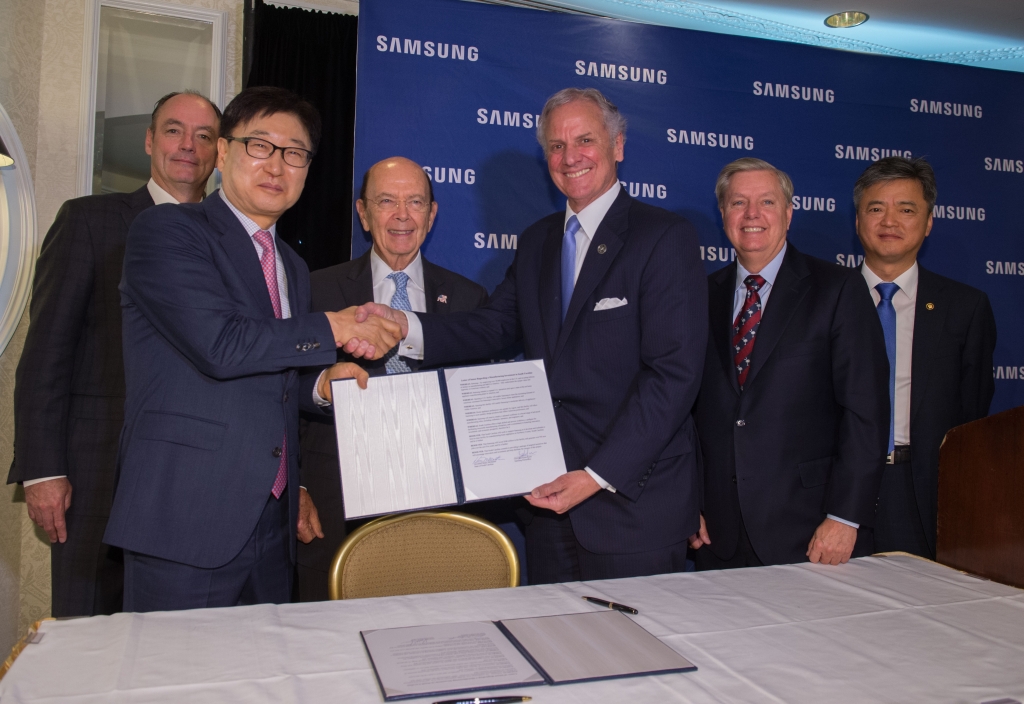 ▲28일(현지 기준) 미국 워싱턴DC에 있는 윌라드 호텔(Willard InterContinental Washington)에서 윤부근 삼성전자 CE부문 대표이사와(앞줄 왼쪽) 헨리 맥마스터(Henry McMaster) 사우스캐롤라이나 주지사가 뉴베리 카운티 삼성전자 가전 공장 설립 투자 의향서(LOI: Letter Of Intent)에 서명하고 있다. 뒷줄은 왼쪽부터 윌버 로스(Wilbur Ross) 미국 상무부 장관, 린지 그라함(Lindsey Graham) 사우스 캐롤라이나 연방상원의원. 이인호 산업통상자원부 1차관, 팀 백스터(Tim Baxter) 삼성전자 미국 법인장
