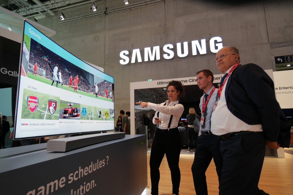 관람객들이 독일 베를린에서 열리는 국제가전박람회 IFA2017 삼성전자 전시장에서 스마트 TV 기능을 체험해 보고 있다.