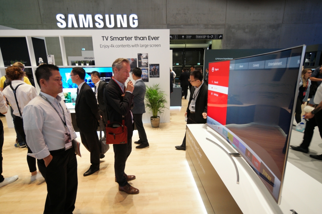 관람객들이 독일 베를린에서 열리는 국제가전박람회 IFA2017 삼성전자 전시장에서 스마트 TV 기능을 체험해 보고 있다.