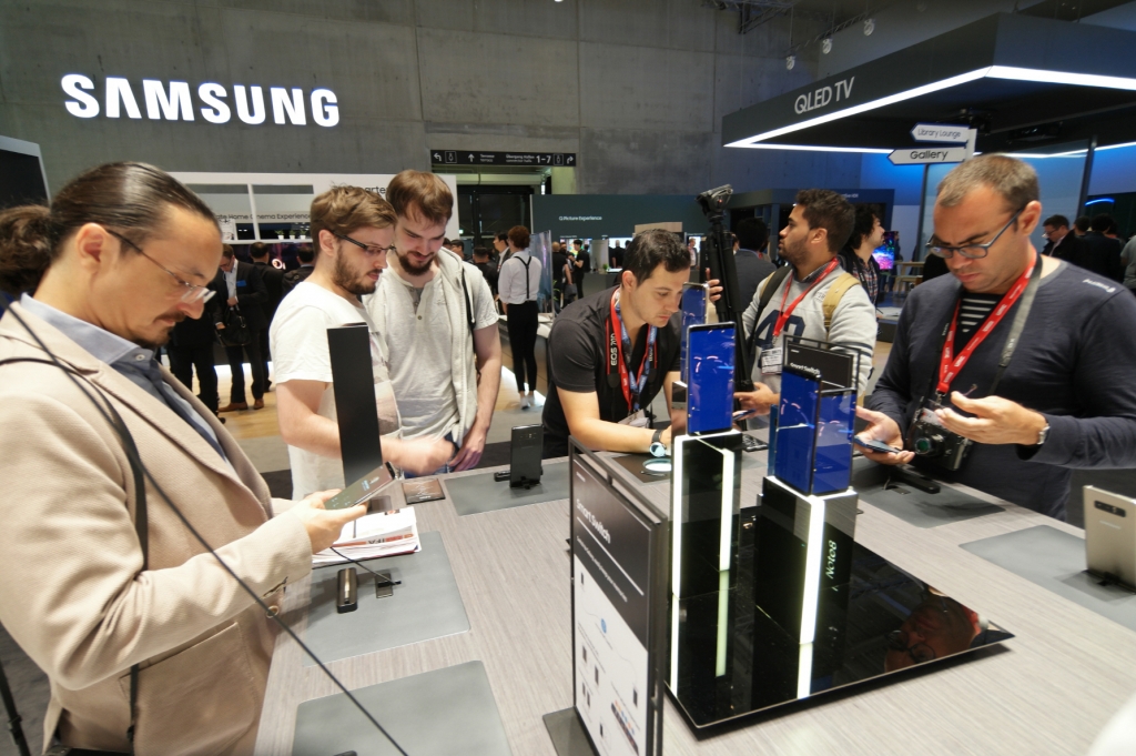 관람객들이 독일 베를린에서 열리는 국제가전박람회 IFA2017 삼성전자 전시장 내에 마련된 모바일 존에서 최신 스마트폰 '갤럭시 노트8'을 살펴보고 있다.