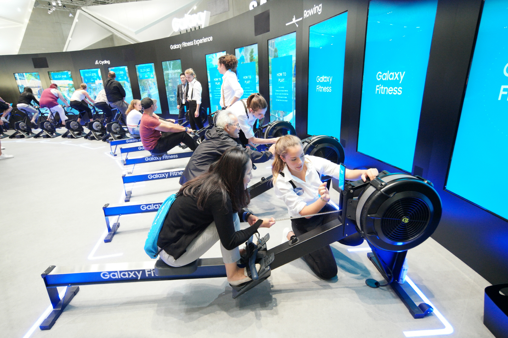 관람객들이 독일 베를린에서 열리는 국제가전박람회 IFA2017 삼성전자 전시장 내 체육관처럼 꾸며진 전용 체험 공간에서 최신 스마트워치 '기어 스포츠'의 피트니스 기능을 체험해보고 있다.