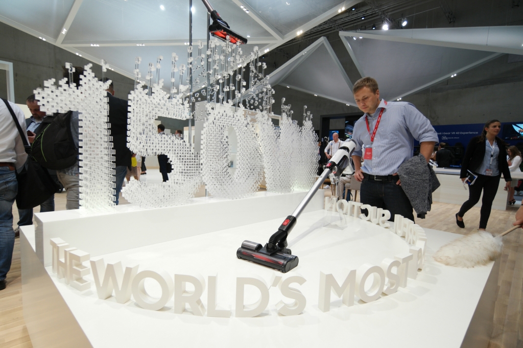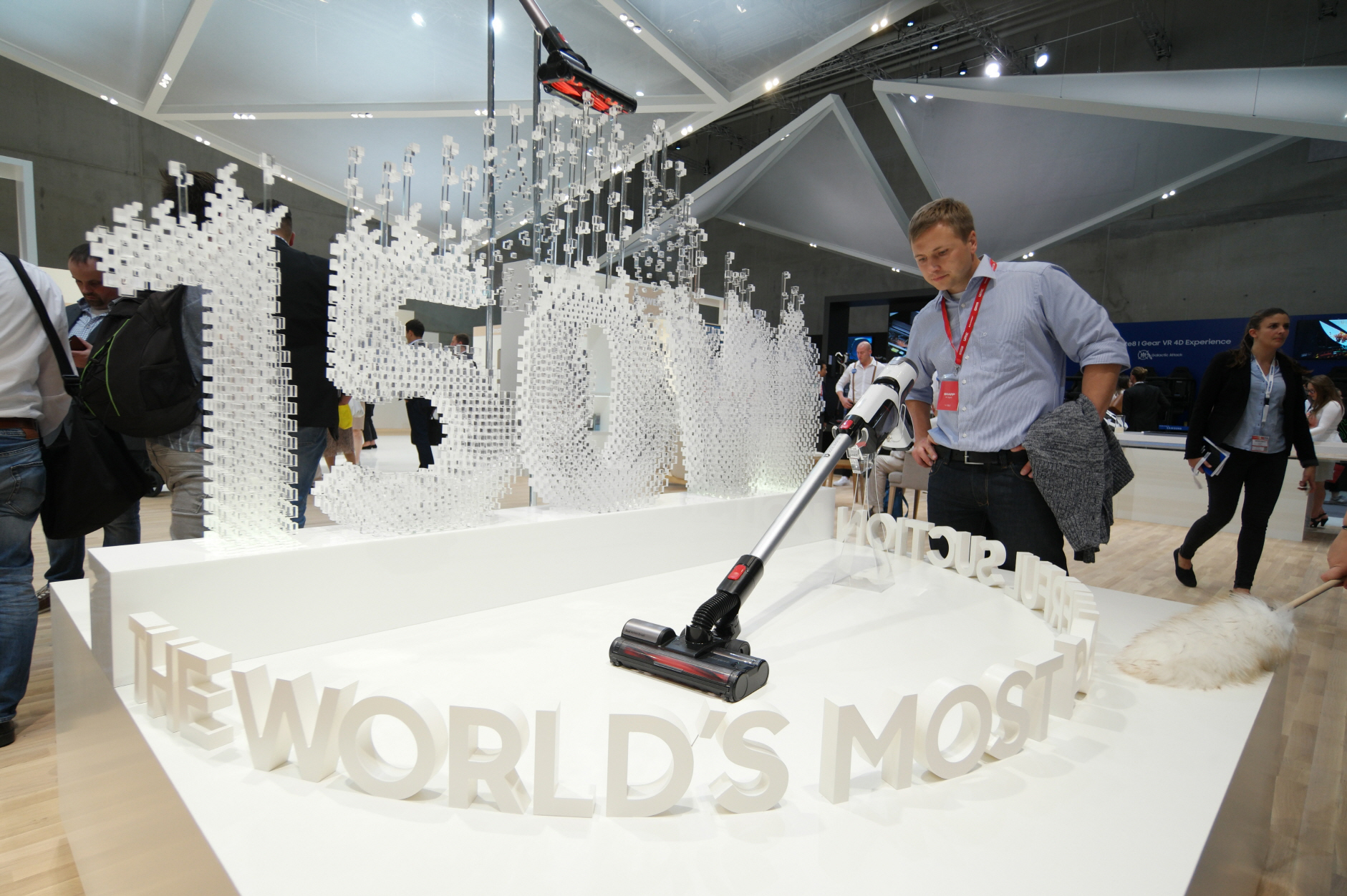 관람객이 독일 베를린에서 열리는 국제가전박람회 IFA2017 삼성전자 전시장에서 업계 최고의 150W 흡입력과 인체공학 설계로 신체 부담을 줄여주는 프리미엄 무선 청소기 신제품 '파워건'을 체험해보고 있다.