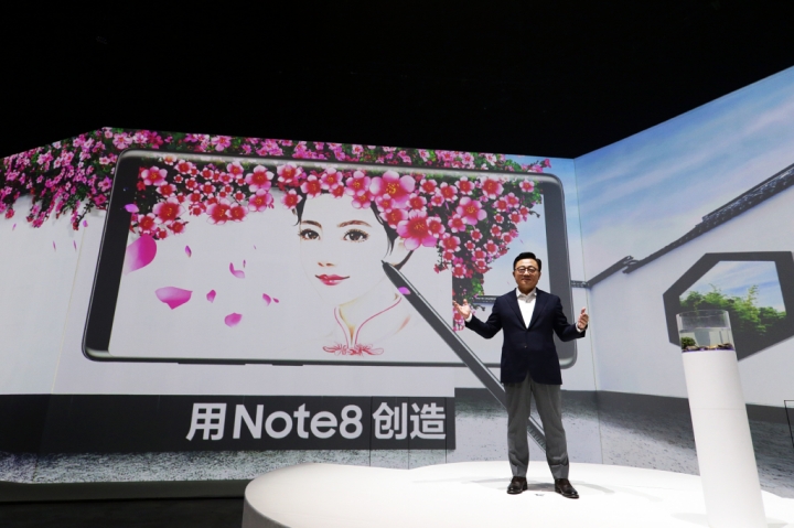 ▲ 삼성전자 무선사업부 고동진 사장이 중국 베이징 798 예술구에서 열린 제품 발표회에서 '갤럭시 노트8'을 소개하고 있다.