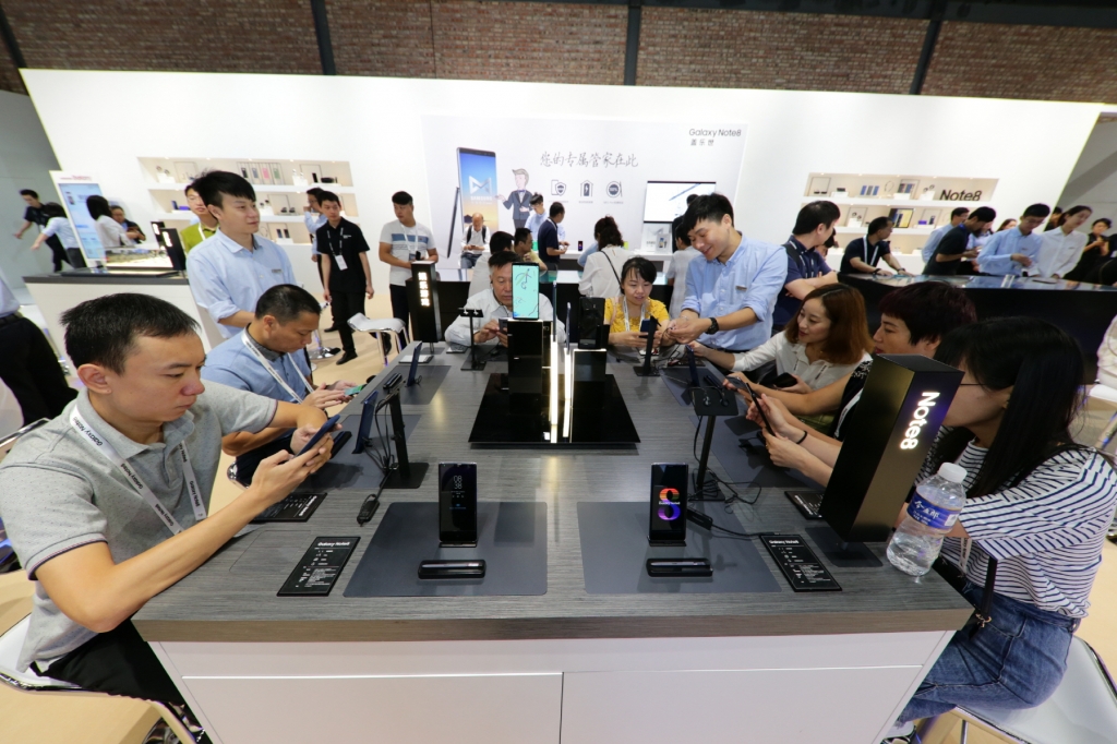 ▲ '갤럭시 노트8' 제품 발표회에 참석한 중국 미디어와 파트너들이 제품을 체험하고 있다.