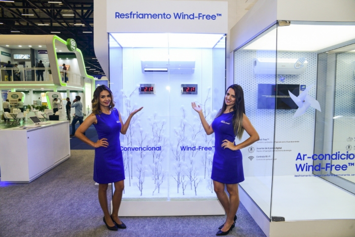삼성전자는 이번 전시회에 참가해 ‘무풍에어컨’ 벽걸이형 제품과 어느 공간에서도 잘 어울리는 원형 디자인이 돋보이는 ‘시스템에어컨 360’등을 전시하고 무풍 체험존을 마련해 관람객들이 직접 무풍 냉방을 경험해 볼 수 있도록 했다. 삼성전자 모델들이 무풍 체험존 앞에서 포즈를 취하고 있다.