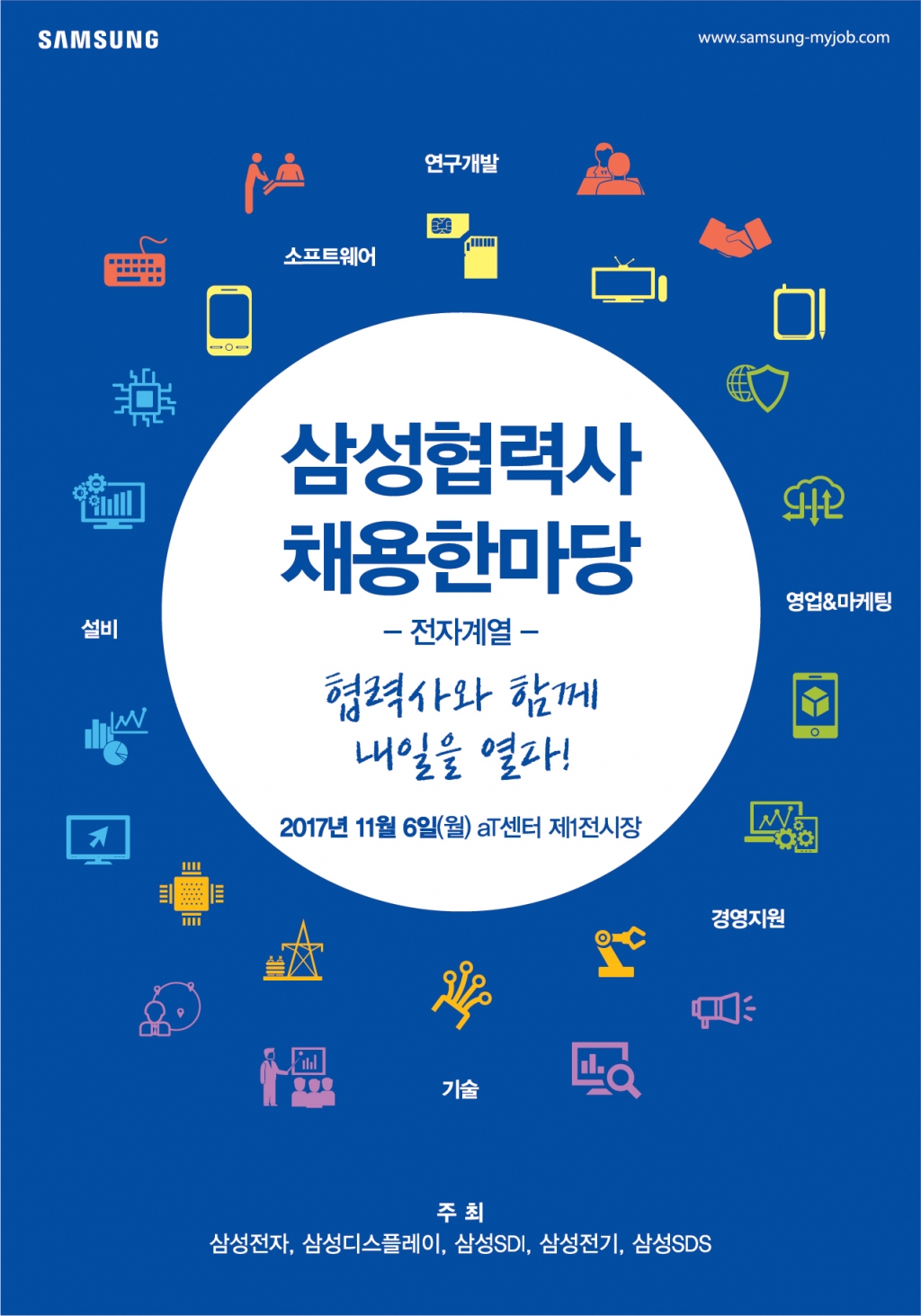 삼성전자는 삼성디스플레이·SDI·전기·SDS 와 함께 다음달 6일 서울 양재동 aT센터에서 전자계열 협력사 120여 개가 참여하는 ‘2017 삼성 협력사 채용 한마당’을 개최한다.