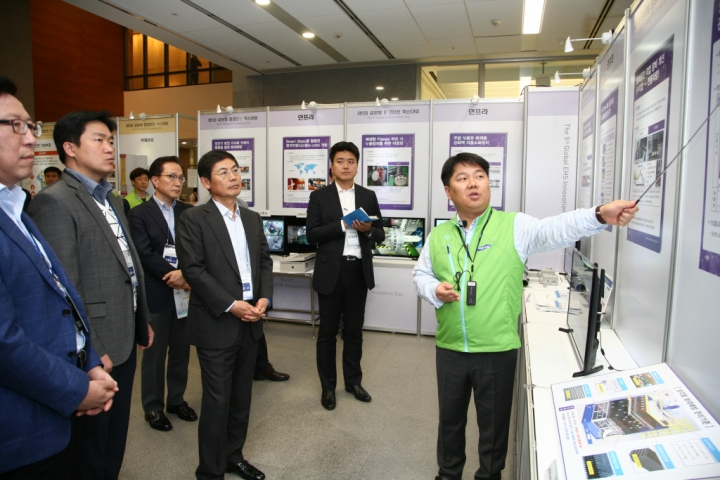 ▲ 24일 삼성전자 수원 디지털시티 R5(모바일연구소)에서 열린 '글로벌 환경안전 혁신대회'에 참석한 삼성전자 경영지원실장 이상훈 사장(앞줄 왼쪽에서 세번째)을 비롯한 임직원들이 환경안전 혁신사례를 살펴보고 있다.