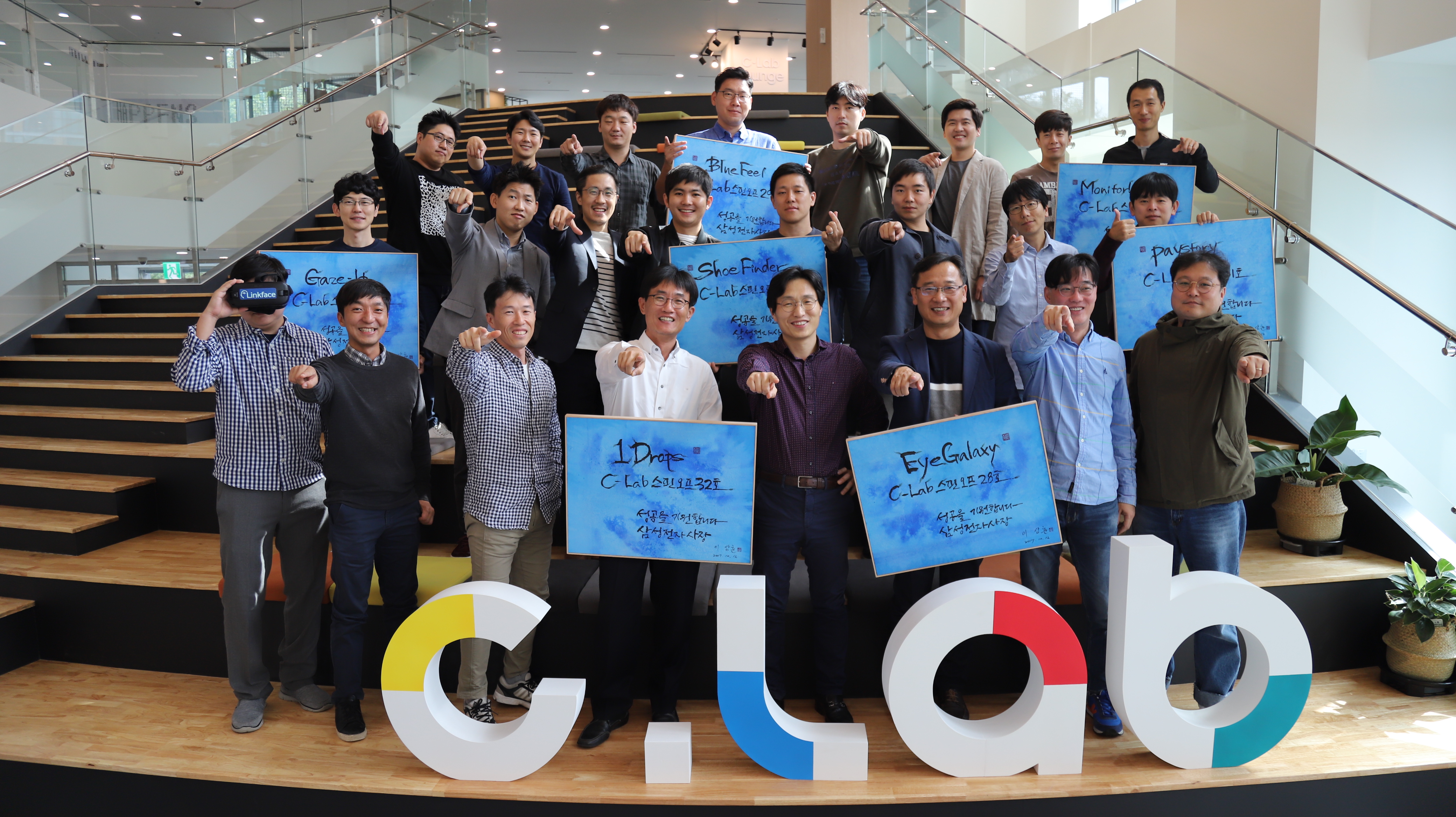 ▲ 삼성전자 C랩을 통해 창업에 나서는 7개 과제 참여 임직원들이 한데 모여 화이팅을 외치고 있다.