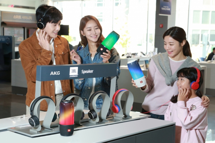 ▲삼성전자 모델들이 서울 강남대로에 위치한 삼성디지털프라자 강남본점에서 JBL과 AKG의 음향기기 신제품을 체험하고 있다.