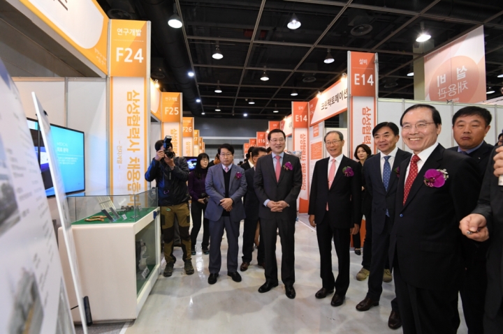 ▲11월 6일 서울 양재동 aT센터에서 열린 '2017 삼성 협력사 채용 한마당'에 참여한 디스플레이부품 전문업체인 '넥스플러스' 조윤형 부사장이 현장을 찾은 안충영 동반성장위원회 위원장(맨 오른쪽), 김현석 삼성전자 CE부문장(사장)(오른쪽에서 두번째), 이용섭 일자리위원회 부위원장(오른쪽에서 네번째)에게 회사 소개를 하고 있다.