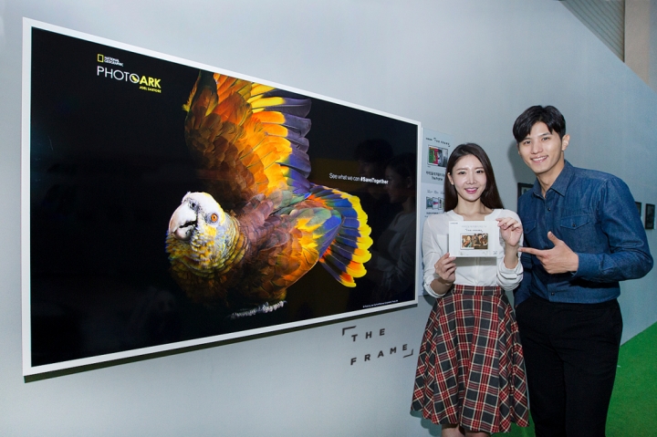 ▲ 삼성전자 모델들이 서울 용산 전쟁기념관에서 열리는 내셔널지오그래픽 특별전에서 멸종 위기 동물인 '무지개아마존앵무' 사진을 삼성 라이프스타일TV '더 프레임'을 통해 감상하고 있다.