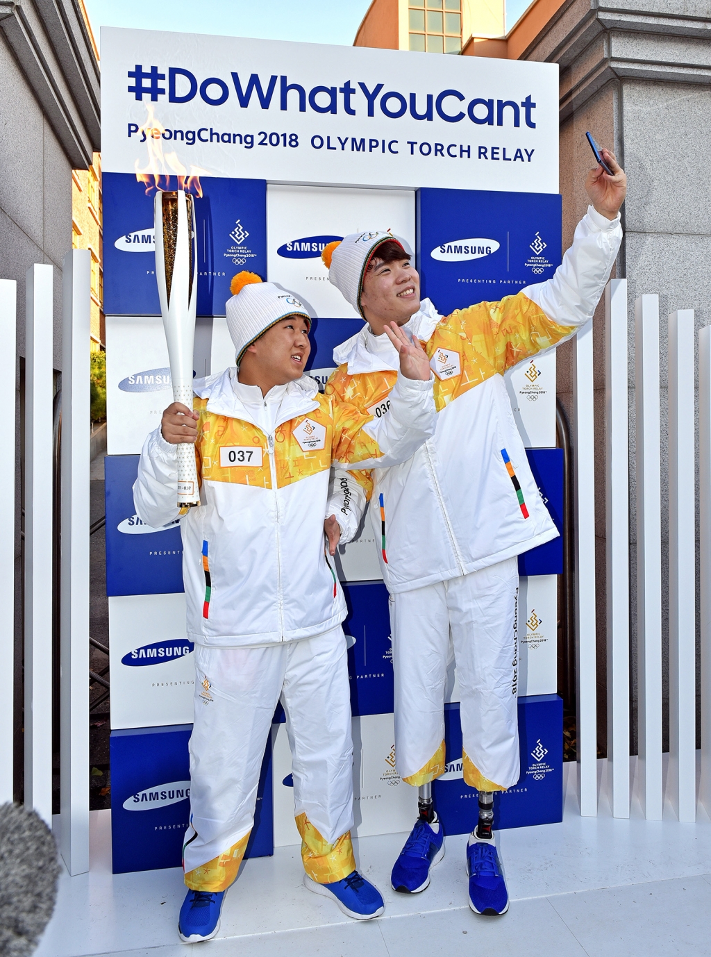 2018 평창동계올림픽 성화봉송 공식후원사인 삼성전자는 11일 경남 김해에서 '로봇다리 수영 선수’로 알려진 전 장애인 수영 국가대표 김세진 선수, 전국장애인수영대회서 신인선수상을 받은 경운중학교 김동훈 선수와 함께 희망의 성화봉송을 펼쳤다.