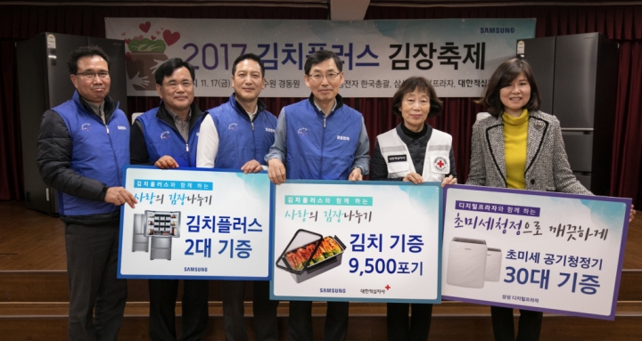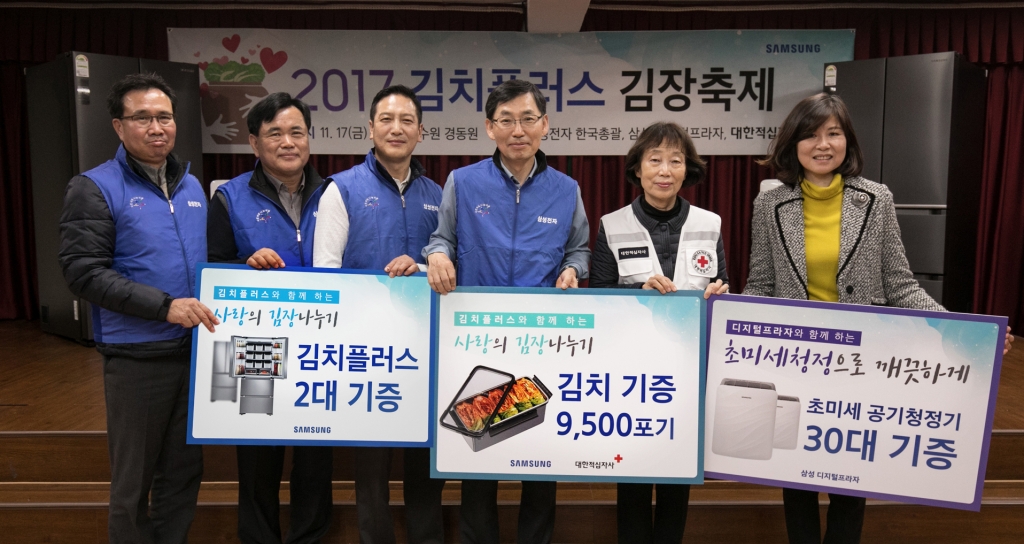 ▲삼성전자 임직원들과 대한적십자사, 경동원 관계자가 수원에 위치한 아동보육시설 '경동원'에서 김치 9500포기와 김치플러스 김치냉장고 2대, 공기청정기 블루스카이 30대를 취약계층에 기증하는 행사를 진행하고 있다. 삼성전자 한국총괄 박병대 부사장(우측에서 세번째), 대한적십자사 김선향 부회장(우측에서 두번째), 경동원 신승주 원장(우측에서 첫번째)