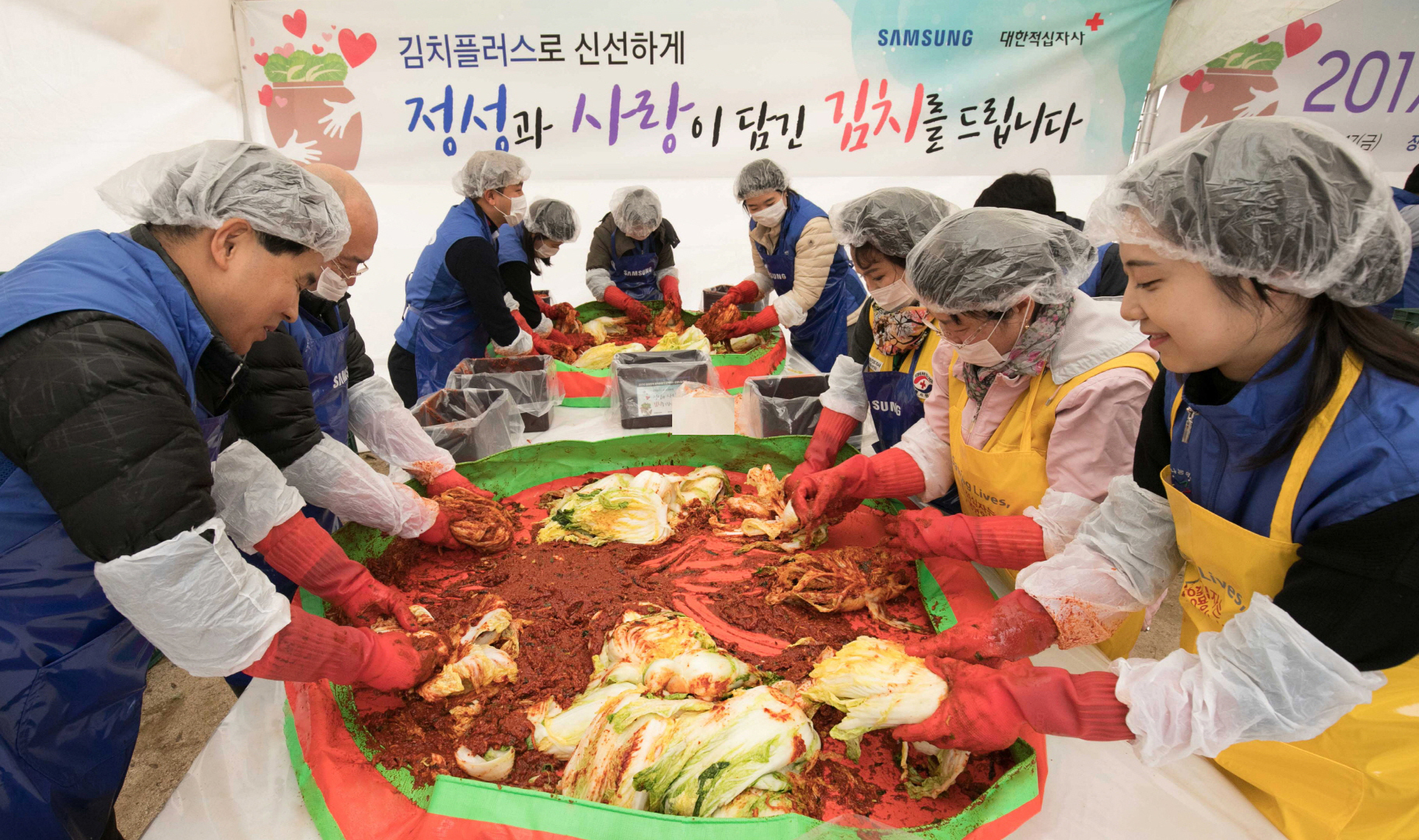 이 행사는 삼성전자 임직원 100여 명이 직접 참여해 대한적십자사와 함께 진행한 것으로 김치플러스 M9500을 상징하는 9500 포기의 김장 김치를 마련했다.