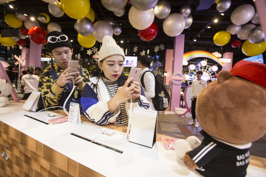 ▲대만 타이페이에 위치한 '갤럭시 노트8 X 라인프렌즈 팝업 스토어' 방문객들이 삼성전자의 최신 모바일 제품을 체험하고 있다.