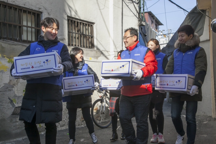 ▲ 삼성전자 임직원들이 6일 서울 동대문 쪽방촌에서 쪽방에 거주하는 어르신들에게 전달할 생필품 세트를 나르고 있다.