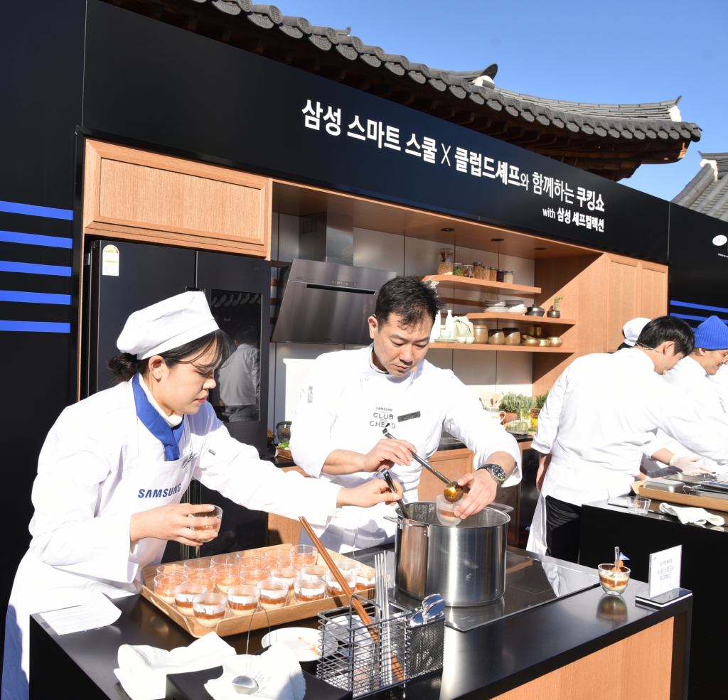 ▲ 지난 1일 전주 한옥마을에서 대한민국 최정상 셰프로 구성된 ‘삼성 클럽드셰프 코리아’의 셰프들과 셰프 꿈나무를 꿈꾸는 한국외식과학고∙전주국제한식조리학교 학생들이 삼성전자의 프리미엄 주방가전을 활용해 쿠킹쇼를 선보이고 있다.