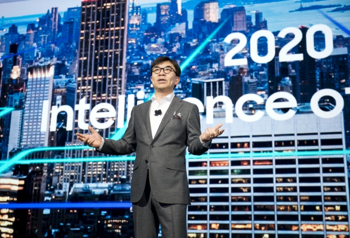 ▲삼성전자는 8일(현지 시간) 미국 라스베이거스에서 세계 최대 전자 전시회 ‘CES 2018’ 개막에 앞서 미래 비전과 2018년 주요 사업을 소개하는 프레스 컨퍼런스를 개최했다. 삼성전자 CE(소비자가전)부문장 김현석 사장이 기기간 연결성을 넘어 지능화된 서비스를 구현하겠다는 'Intelligence of Things' 비전을 발표하고 있다.