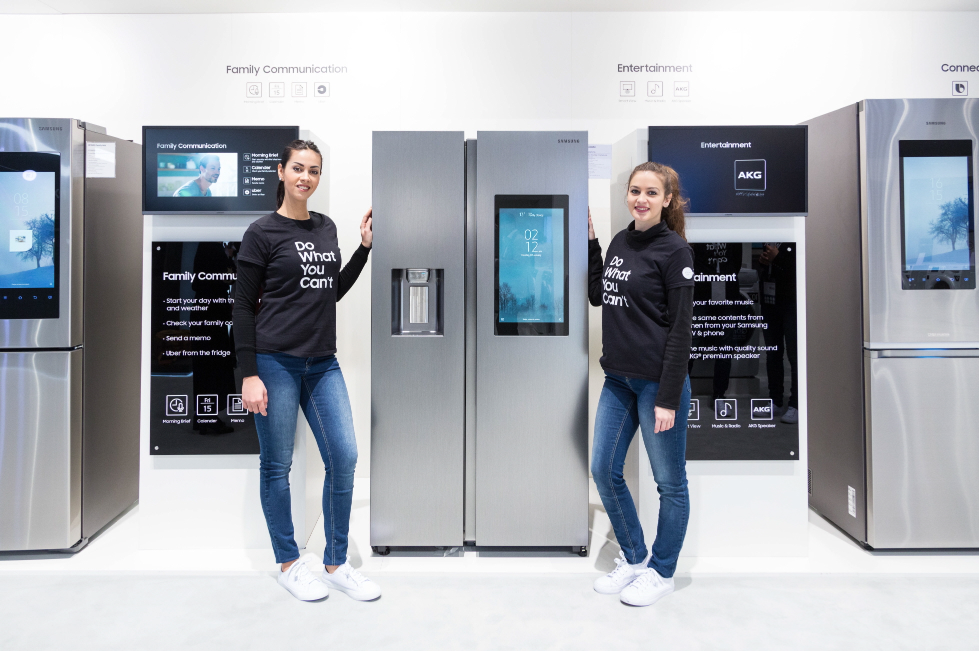 ▲ 삼성전자 모델들이 '삼성 포럼' 전시부스에서 진화된 음성인식 기술과 연결성으로 한층 강화된 '2018년형 패밀리허브' 양문형 타입 냉장고를 소개하고 있다.