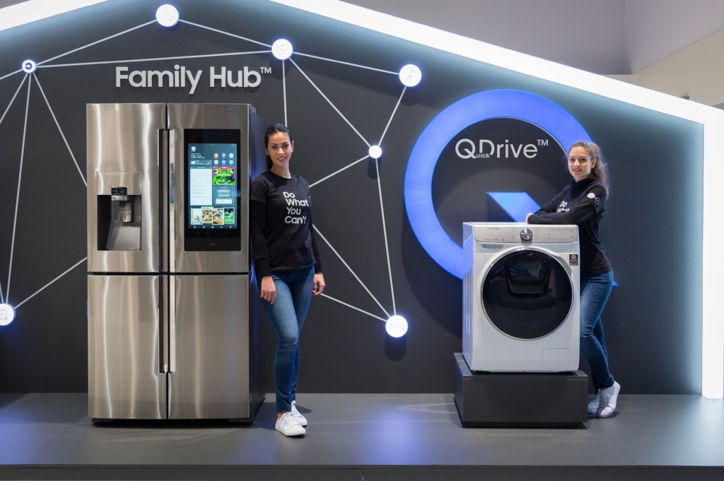 ▲ 삼성전자 모델들이 '삼성 포럼' 전시부스에서 '2018년형 패밀리허브' 4도어 타입 냉장고와 ‘퀵드라이브’ 세탁기를 소개하고 있다.