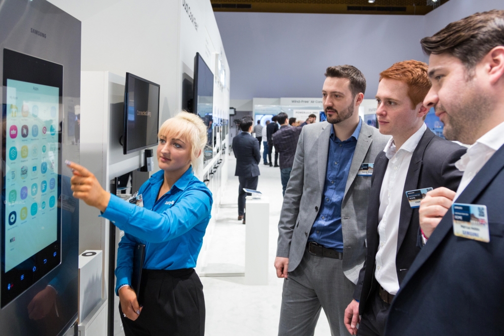 ▲ 유럽 주요 거래선들이 '삼성 포럼' 전시 부스에서 진화된 음성인식 기술과 연결성으로 한층 강화된 '2018년형 패밀리허브' 냉장고를 살펴보고 있다.
