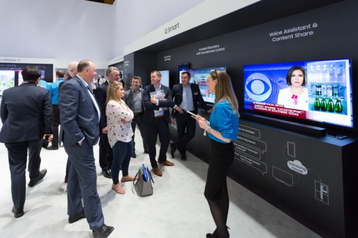 ▲ 유럽 주요 거래선들이 '삼성 포럼' 전시 부스에서 '2018년형 삼성 스마트 TV'의 기능을 살펴보고 있다.
