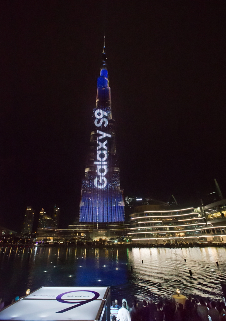 삼성전자가 현지시간 3월 2일부터 아랍에미리트 두바이에 있는 세계 최고(最高) 빌딩 부르즈 칼리파(Burj Khalifa)에 초대형 '갤럭시 S9'·'갤럭시S9+' 출시 광고를 진행했다.