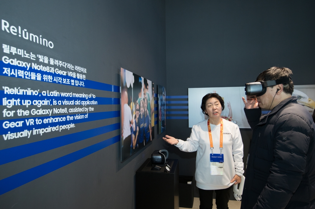 '서울 하상장애인복지관' 시각 장애인들이 강릉 올림픽 파크에 위치한 ‘삼성 패럴림픽 쇼케이스’에 13일 방문해, 최신 모바일 기술과 저시력인용 시각장애 보조 애플리케이션 ‘릴루미노(Relumino)’ 를 체험했다.