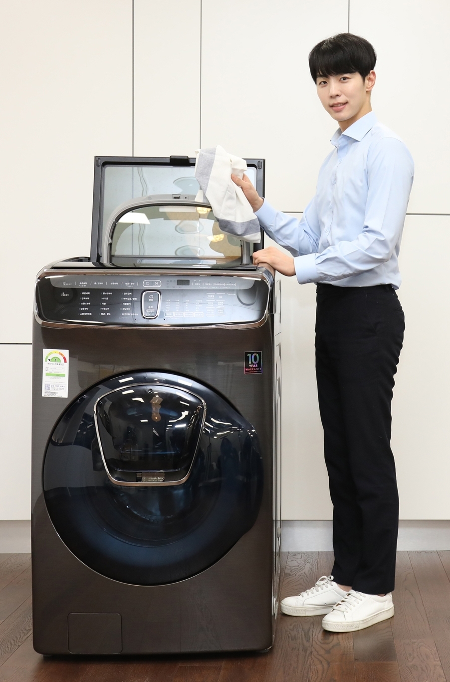 ‘플렉스워시’는 상부에 소용량 전자동 세탁기 ‘콤팩트워시’를, 하부에 대용량 드럼세탁기 ‘애드워시’를 일체형으로 결합한 제품으로 세탁물의 양·종류·색상 등에 따라 동시 또는 분리 세탁이 가능한 ‘3도어 올인원’ 세탁기이다.