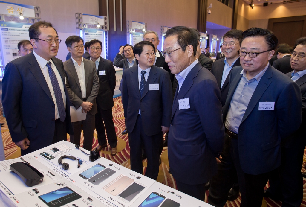 ▲ 6일 서울 양재동 더케이호텔에서 열린 삼성전자와 협력사가 모여 동반성장을 다짐하는 '상생협력데이' 행사에서 김기남 삼성전자 사장(오른쪽에서 두번째)과 고동진 삼성전자 사장(오른쪽에서 첫번째) 등 삼성전자 경영진이 우수 협력사 기술 전시회를 둘러보고 있다.