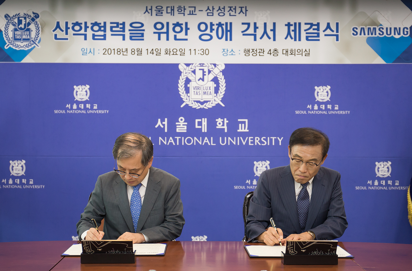 ▲ 삼성전자와 서울대가 14일 서울대학교 관악캠퍼스에서 산학협력을 위한 양해각서 체결식을 가졌다. (좌측 서울대 박찬욱 총장 직무대리, 우측 삼성전자 김기남 대표이사)