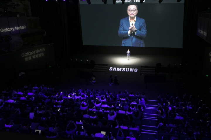 ▲ 지난 15일(현지시간) 중국 상하이에서 진행된 ‘갤럭시 노트9’ 출시 행사에서 IM부문장 고동진 사장이 ‘갤럭시 노트9’을 소개하는 모습