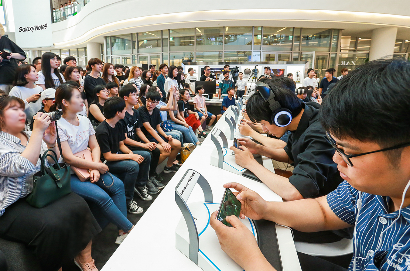 삼성전자가 '갤럭시 노트9' 국내 출시를 기념해 영등포 타임스퀘어 롯데월드몰 파미에스테이션, 대구 동성로, 부산 서면, 광주 충장로 등 전국 6개 갤럭시 스튜디오에서 ‘갤럭시 노트9 X 배틀그라운드 모바일 스페셜 챌린지’를 진행했다.
