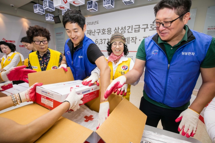 삼성전자는 6일 서울 양천구 대한적십자사 긴급구호종합센터에서 태풍, 수해 등 재난 발생시 이재민에게 필요한 5억원 상당의 긴급구호품 6,373세트를 전달했다.