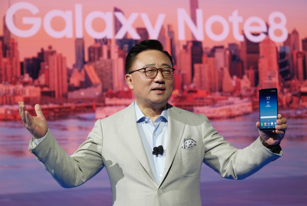 ▲현지시간 23일 뉴욕에서 진행된 '삼성 갤럭시 언팩 2017'에서 삼성전자 무선사업부 고동진 사장이 '갤럭시 노트8'을 소개하고 있다.