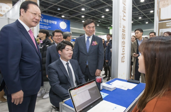 ▲ 11월 12일 서울 aT센터에서 열린 ‘2018 삼성 협력사 채용 한마당’을 찾은 구직자가 삼성전자 반도체 협력사 ‘피에스케이’ 부스에서 채용 면접을 보고 있다. 이 자리를 찾은 동반성장위원회 권기홍 위원장(왼쪽)과 삼성전자 김현석 대표이사 사장(오른쪽)이 면접을 보는 구직자(가운데)를 응원하고 있다.