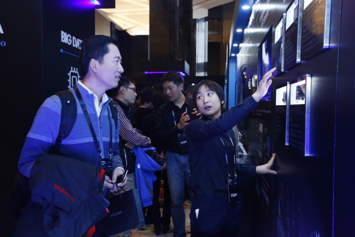 ▲ 15일 중국 베이징 누오호텔에서 개최된 삼성 미래기술포럼을 찾은 참석자들이 삼성전자의 AI 솔루션을 살펴보고 있다.