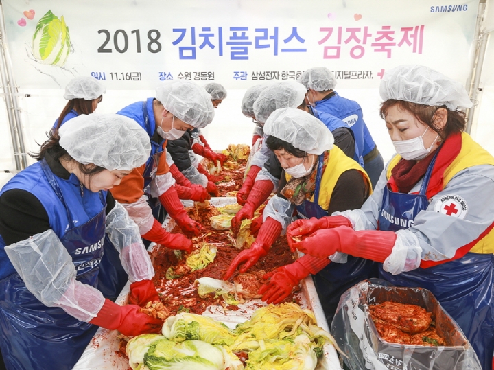 ▲ 16일 삼성전자 임직원들이 대한적십자와 함께 수원에 위치한 아동보육시설 ‘경동원’에서 ‘김치플러스 김장축제’를 열고 김치를 담그고 있다. 이날 마련된 김치는 총 8천여 포기로 전국의 2천여 세대 취약계층과 ‘경동원’에 전달될 예정이며, 삼성전자는 ‘경동원’에 김장김치 외에도 김치냉장고 ‘김치플러스’, 의류청정기 ‘에어드레서’, 무선청소기 ‘파워건’ 등 최신 가전 제품 23대도 기증해 온정을 나눴다.