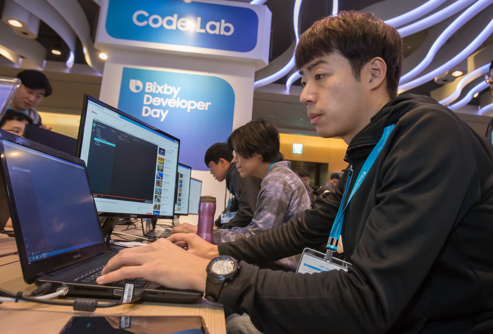 ▲ ‘삼성 빅스비 개발자데이’에 참석한 개발자들이 빅스비 code 프로그램을 체험하고 있다.