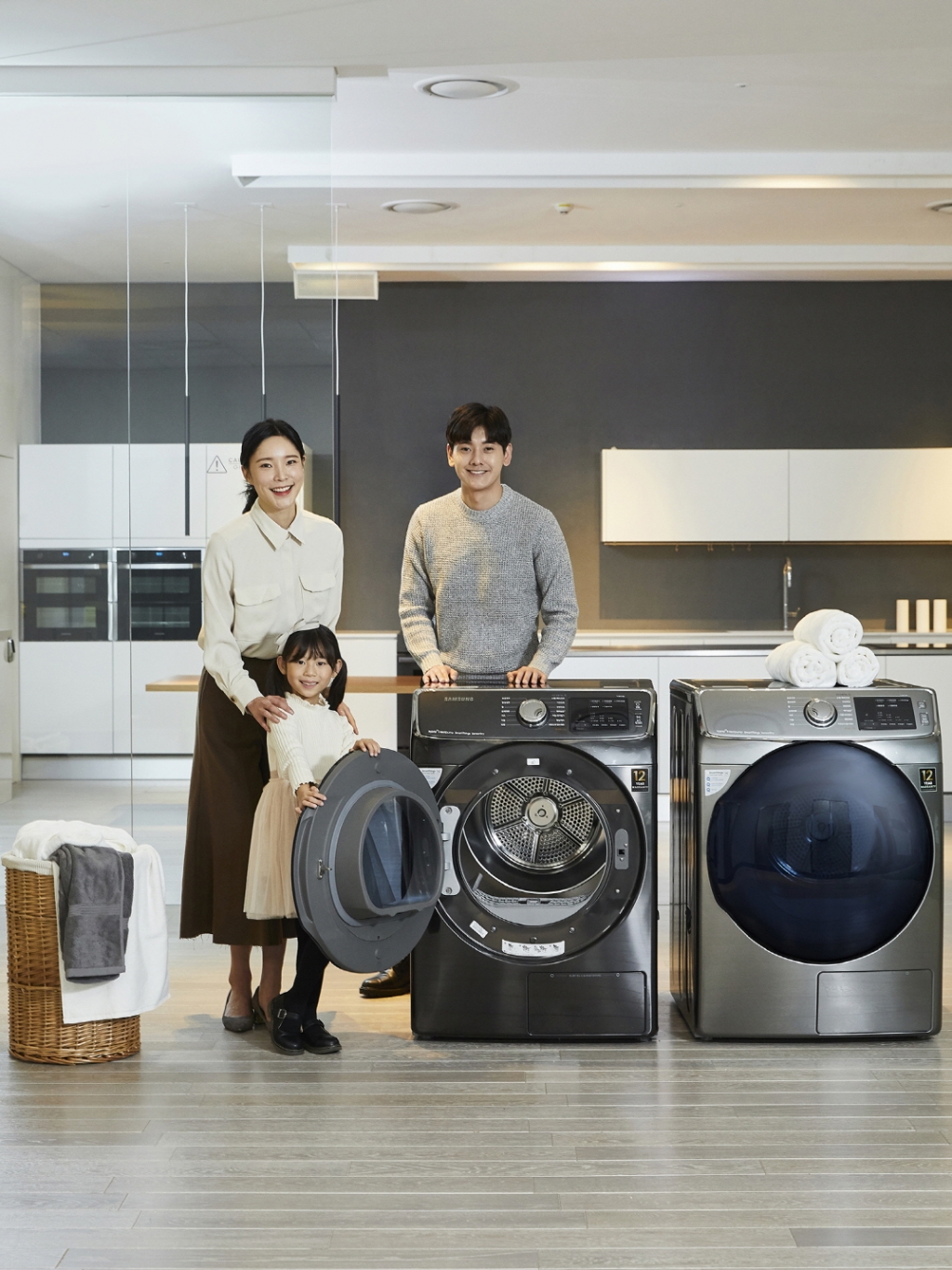 ▲ 삼성전자가 건조기 ‘그랑데’ 제품군에 16kg 신모델을 출시하며 국내 건조기 대용량 시장 확대에 박차를 가한다. 삼성전자 모델들이 '그랑데' 제품을 소개하고 있다.