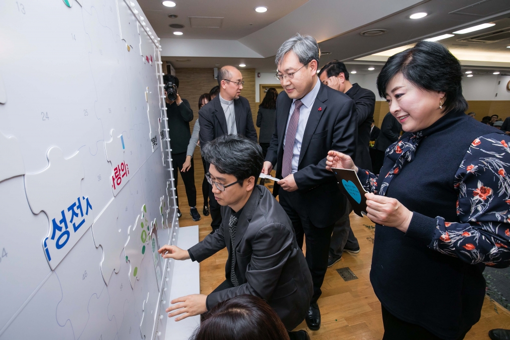 ▲ 28일 서울 중구 사회복지공동모금회 회관에서 진행된 ‘나눔과 꿈’ 선정기관 전달식에 참여한 비영리단체 대표들이 ‘나눔과 꿈’을 소재로 한 모자이크 퍼즐을 맞추고 있다.