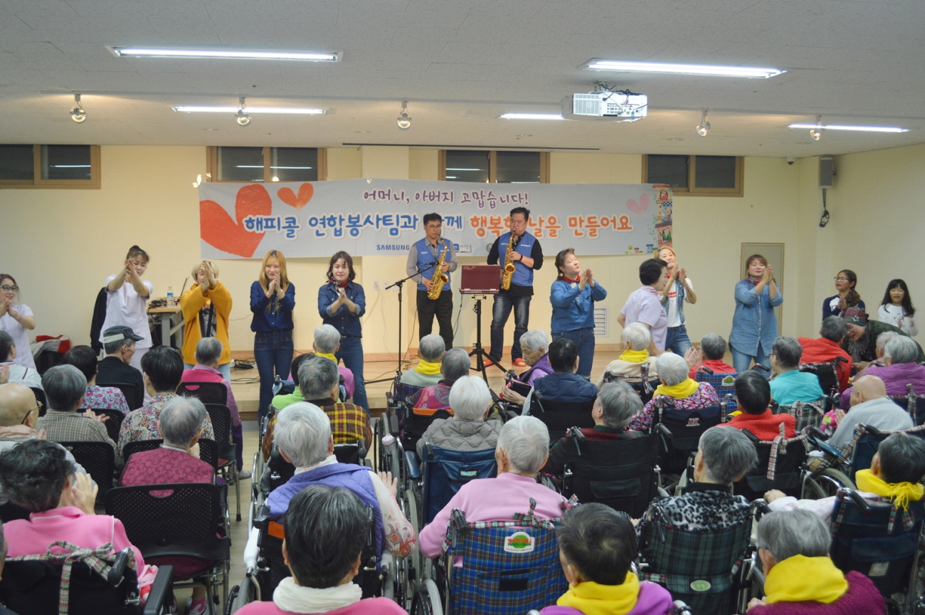 ▲ 연말을 맞아 삼성전자 임직원들이 화성 묘희원을 찾아 어르신들 앞에서 공연을 하고 있다.