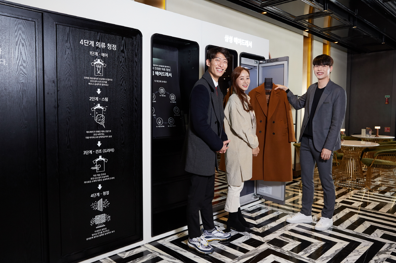 ▲ 삼성전자가 CGV 씨네드쉐프(CINE de Chef)에서 삼성 의류청정기 ‘에어드레서’를 활용한 코트룸(Coatroom) 서비스를 운영해 방문객들로부터 큰 인기를 얻고 있다. CGV 씨네드쉐프 용산아이파크몰점 6층 레스토랑에서 모델들이 삼성 ‘에어드레서’ 코트룸 서비스를 이용하고 있다.