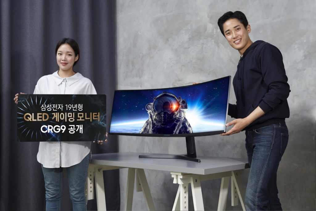 ▲ 삼성전자가 CES 2019에서 업무 공간의 변화를 가져올 ‘스페이스 모니터’와 화질 혁신을 보여줄 ‘커브드 QLED 게이밍 모니터’ 신제품을 공개한다. 삼성전자 모델들이 ‘커브드 QLED 게이밍 모니터(모델명: CRG9)’를 소개하고 있다.
