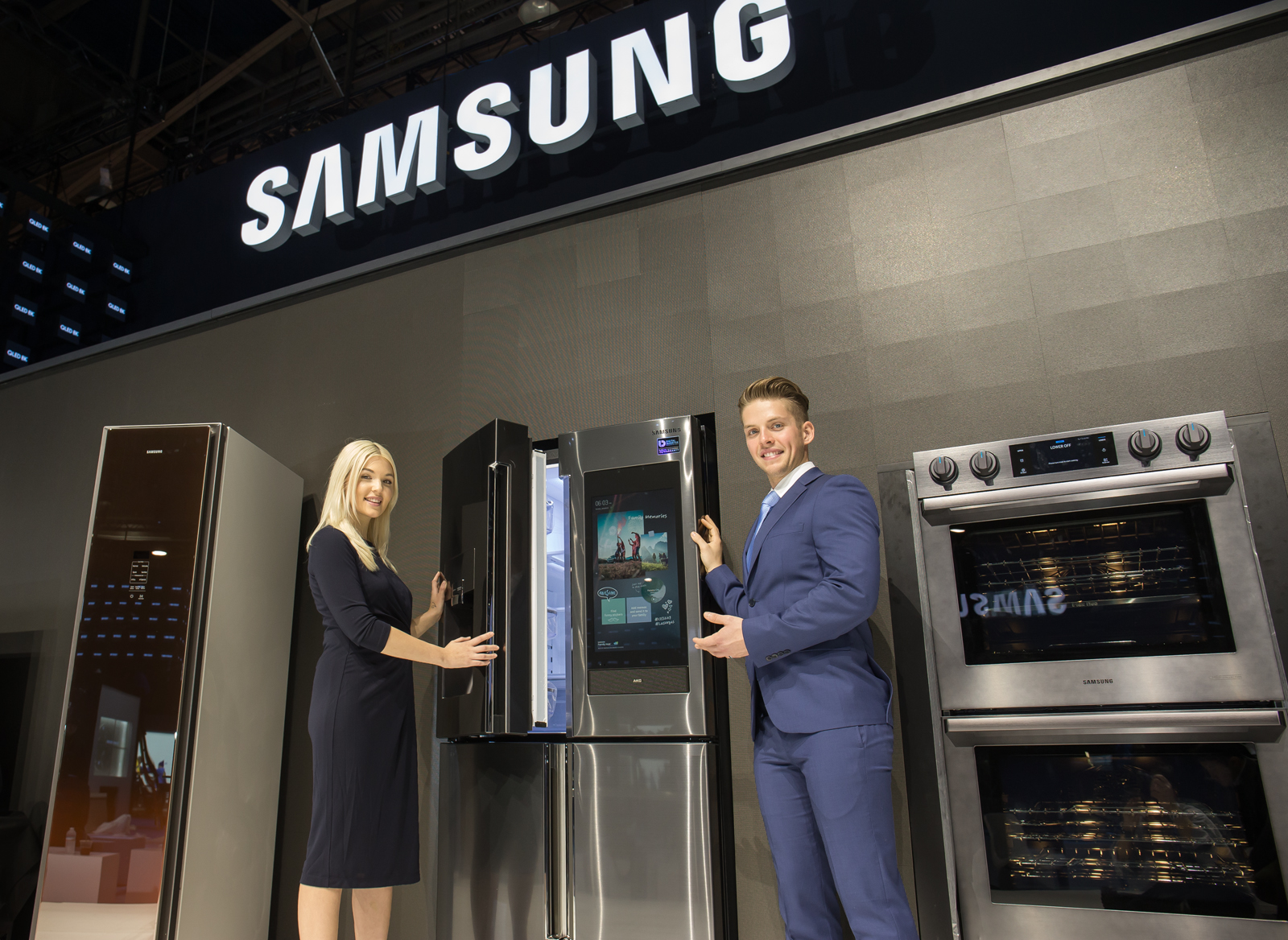 ▲ 삼성전자 모델들이 미국에서 열리는 세계 최대 전자 전시회 CES 2019에서 2019년형 패밀리허브 제품을 소개하고 있다.