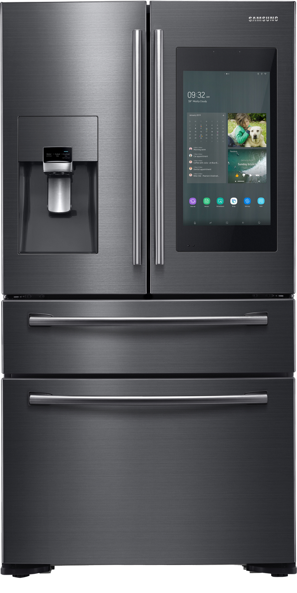 ▲ 삼성전자가 미국 라스베이거스에서 열리는 세계 최대 전자 전시회 CES 2019에서 4년 연속 CES 혁신상을 수상한 2019년형 ‘패밀리허브’ 냉장고 신제품을 공개했다. 사진 2는 삼성 2019년형 패밀리허브 제품(모델명: RF22NPEDBSG)