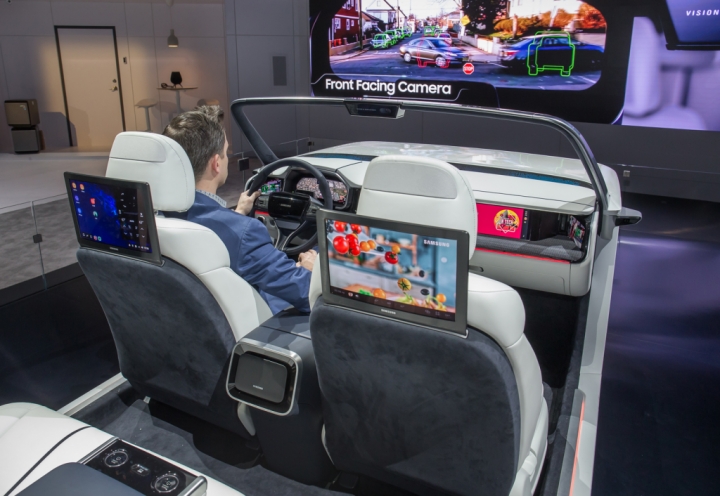 ▲ 세계 최대 전자 전시회 CES 2019가 개막한 8일(현지시간) 미국 라스베이거스 컨벤션센터(LVCC)의 삼성전자 부스에서 삼성전자 모델이 개인에게 최적화된 환경과 인포테인먼트 시스템을 제공하는 차량용 ‘디지털 콕핏 2019’를 시연하고 있다.