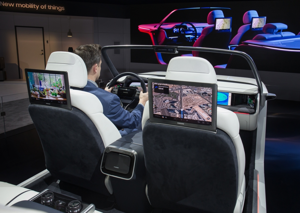 ▲ 세계 최대 전자 전시회 CES 2019가 개막한 8일(현지시간) 미국 라스베이거스 컨벤션센터(LVCC)의 삼성전자 부스에서 삼성전자 모델이 개인에게 최적화된 환경과 인포테인먼트 시스템을 제공하는 차량용 ‘디지털 콕핏 2019’를 시연하고 있다.