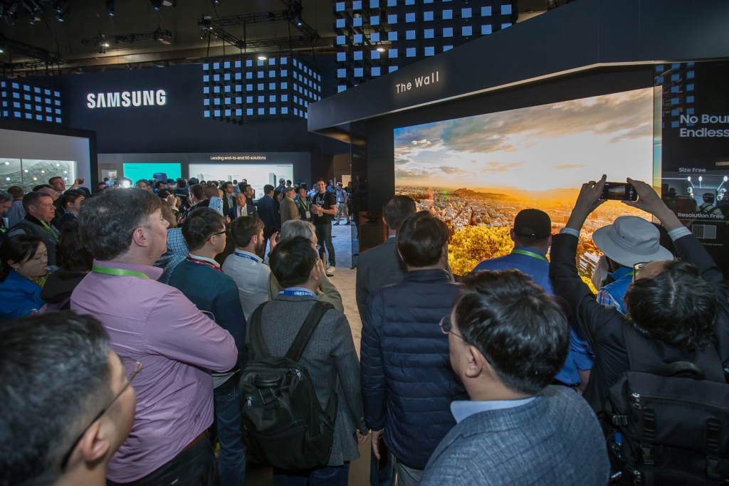 ▲ 미국 라스베이거스에서 열리는 세계 최대 전자 전시회 CES 2019 개막일인 8일(현지시간) 삼성전자 전시관에서 관람객들이 압도적인 크기와 생생한 화질을 자랑하는 2019년형 ‘더 월’을 살펴보고 있다.